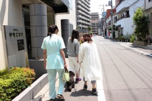 座学のあと、担当のワンちゃんとお散歩へ行くため、校舎の外へ行きました